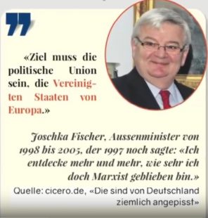 Ich könnte noch eine gewaltige Anzahl von Zitaten anführen, etwa von Joschka Fischer, dem ehemaligen Außenminister der BRD, der öffentlich gesagt hat, dass man „Deutschland von innen heraus verdünnen müsse“, bis hin zu Programmen der Europäischen Union, die selbiges ebenfalls offen und frei heraus propagieren.